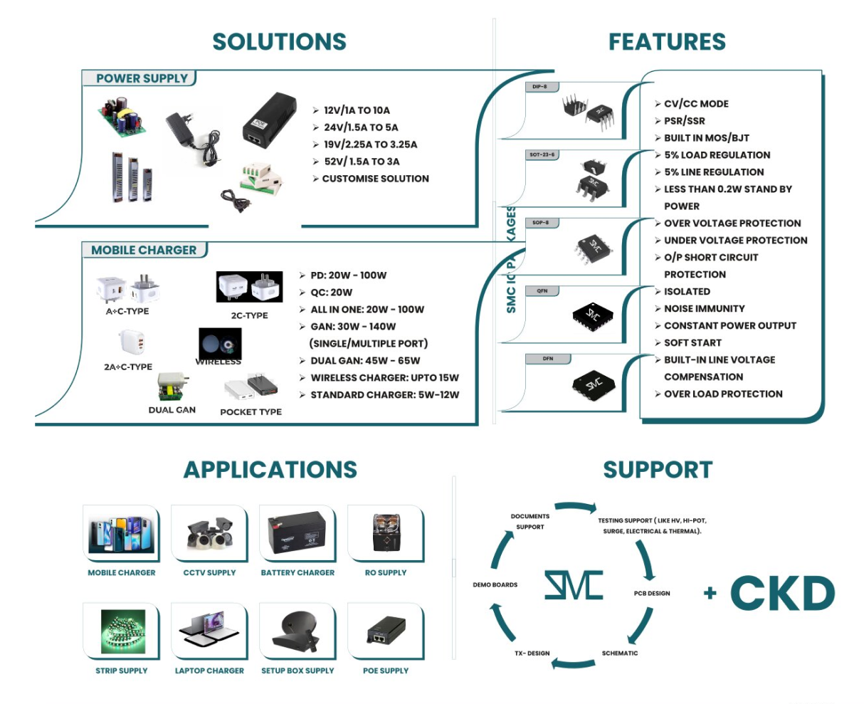 CHARGERS SMPS (Switched-Mode Power Supply) is a high-efficiency power converter that transforms AC to regulated DC using fast switching techniques. It’s widely used in mobile chargers for compact design, low heat, and reliable, energy-efficient charging.